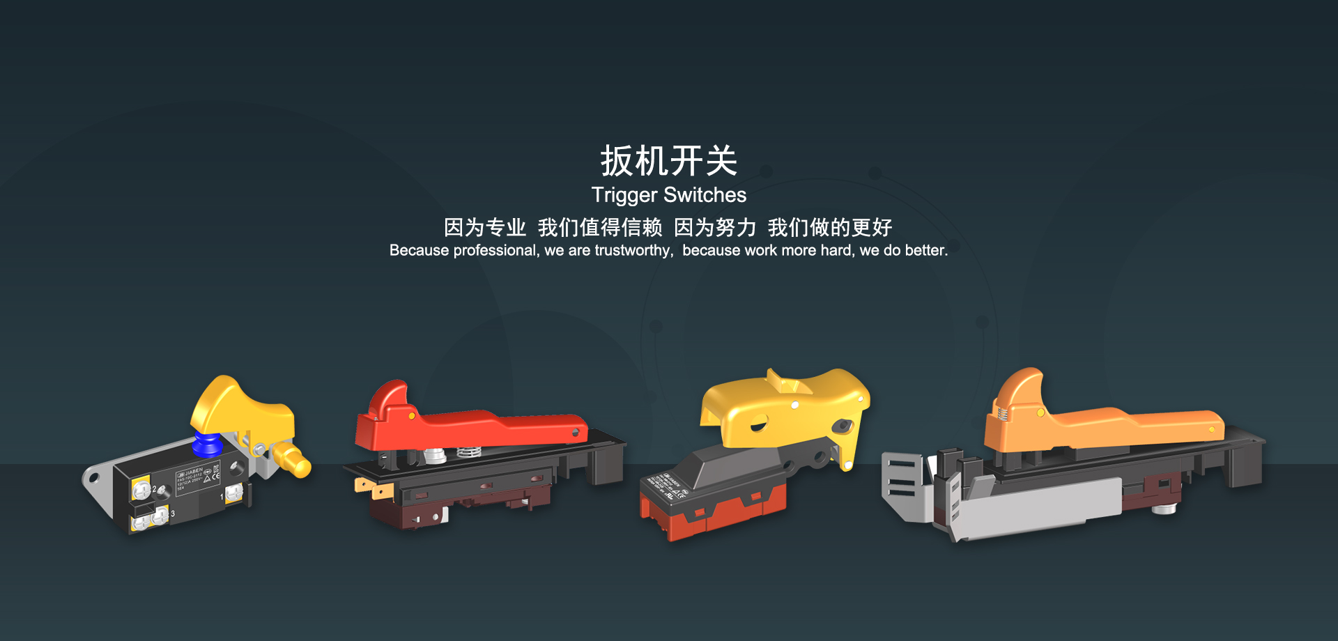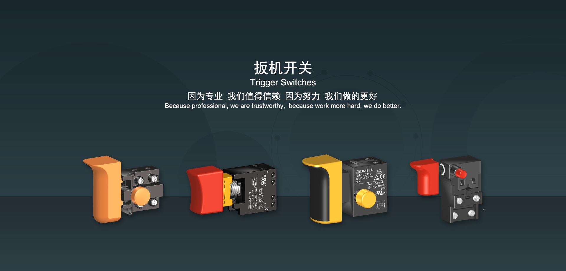 浙江佳奔電子有限公司始建于1986年,坐落于浙江省樂清市虹橋鎮(zhèn)東電子信息產(chǎn)業(yè)園內(nèi),現(xiàn)有職工700多人,資產(chǎn)總額超3億元。公司主要經(jīng)營“JIABEN”牌微動開關(guān)、蹺板開關(guān)、按鈕開關(guān)、扳機開關(guān)、調(diào)速開關(guān)和電位器開關(guān)等各類交、直流器具開關(guān)和各類交、直流線路板模塊等產(chǎn)品,主要應(yīng)用于交、直流電動工具、電動園林工具、清潔器具、家用電器和小型機床等行業(yè),是集產(chǎn)品設(shè)計、研發(fā)、制造、銷售和服務(wù)于一體的國家高新技術(shù)企業(yè)。JIABEN was founded in 1986, located in East Electronic Information Industry Park, Hongqiao Town, Yueqing City, Zhejiang Proviance, existing staff more than 700 peoples, more than 300 million RMB worth of assets. Company is mainly engaged in "JIABEN" brand Micro Switch, Rocker Switch, Push-button Switch, Trigger Switch, Speed Regulating Switch, Potentiometer Switch and other kinds of appliance switch and all kinds of AC or DC circuit board module, such as more than 100 series, 8000 kinds of models of products, mainly used in AC or DC Power-tools, Power Gardening Tools, Cleaning Appliances, Household Appliances and Small Machine Tool and other industries, is the collection product design, research and development, manufacturing, sales and service in one of the national high and new technology enterprise.